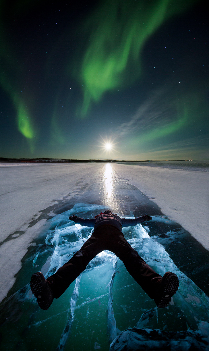 An incredible night on Yellowknife's amazing ice road: turquoise ice, rising moon and incredible aurora curtains.