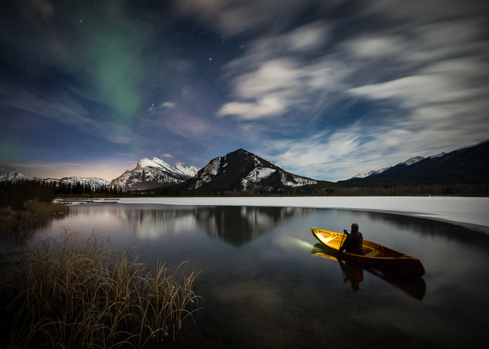 Exploring Banff's lakes by starlight as the Milky Way rises over Two Jack Lake.