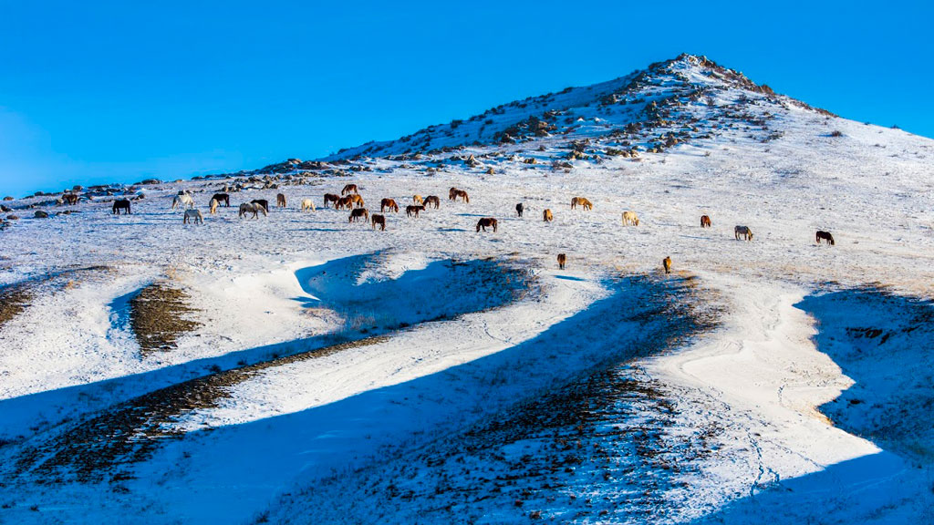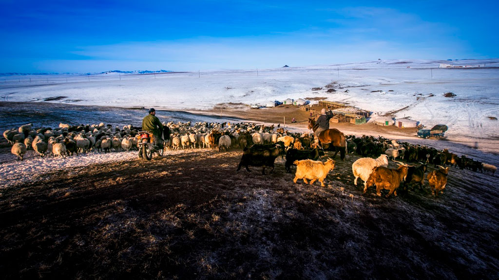 Dari dataran yang diselimuti oleh salju, menuju pegunungan Altai yang megah, Mongolia membentang di area seluas tiga kali ukuran Perancis. Ini adalah negara yang kontras - dengan pencakar langit beton dari ibukotanya yaitu Ulan Bator yang hampir tak terlihat melalui asap tebal dari pembakaran batubara, sementara padang belantara yang tidak tercemar masih membentang di bawah sinar matahari musim dingin.
