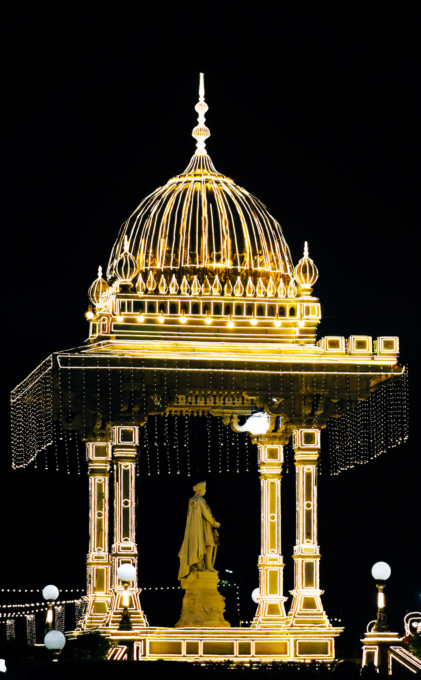 As the city drifted into slumber, the monument stood bathed in a golden glow — a timeless guardian of Mysuru’s royal legacy. Each strand of light whispered stories of kings, culture, and pride. Beneath the dome, history itself seemed to breathe, glowing quietly against the endless dark. In that stillness, the past and present met — radiant, regal, and unforgettable.