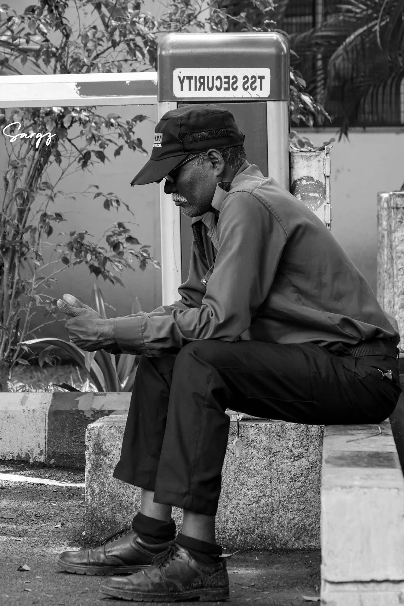 The frame freezes a moment most would walk past — a lone security guard standing under a pale streetlight, his posture steady, his eyes somewhere between alert and distant. In black and white, the distractions fade — no color, no chaos — just duty and silence. You can almost hear the echo of passing footsteps, the hum of a city that never pauses for anyone. He’s not guarding a building; he’s guarding his dignity, his routine, his reason to still show up every morning. The wrinkles under his eyes tell of nights spent in the cold, watching a world that barely notices his presence. Yet there’s something powerful in that stillness — a quiet pride that says, “Even when no one looks, I stand.” Maybe that’s why the photo feels heavy — not because it’s sad, but because it’s real. A reminder that every unnoticed face in the crowd is living a story worth telling. - Sargz