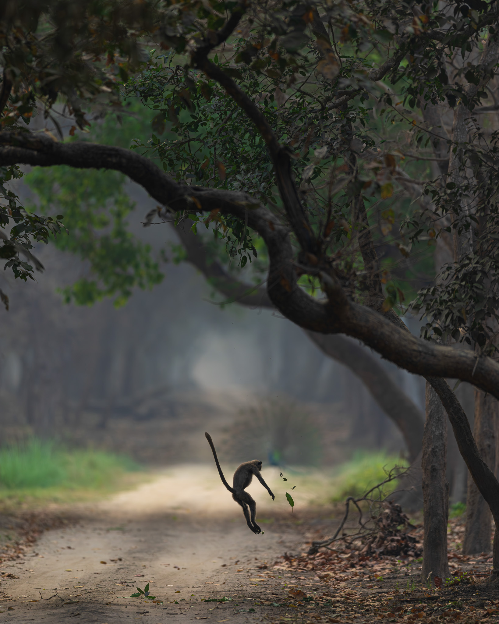 "A monkey jumps from one tree branch to another, causing leaves to scatter, while nearby, a peacock displays its feathers and performs a courtship dance against a backdrop of dense foliage."