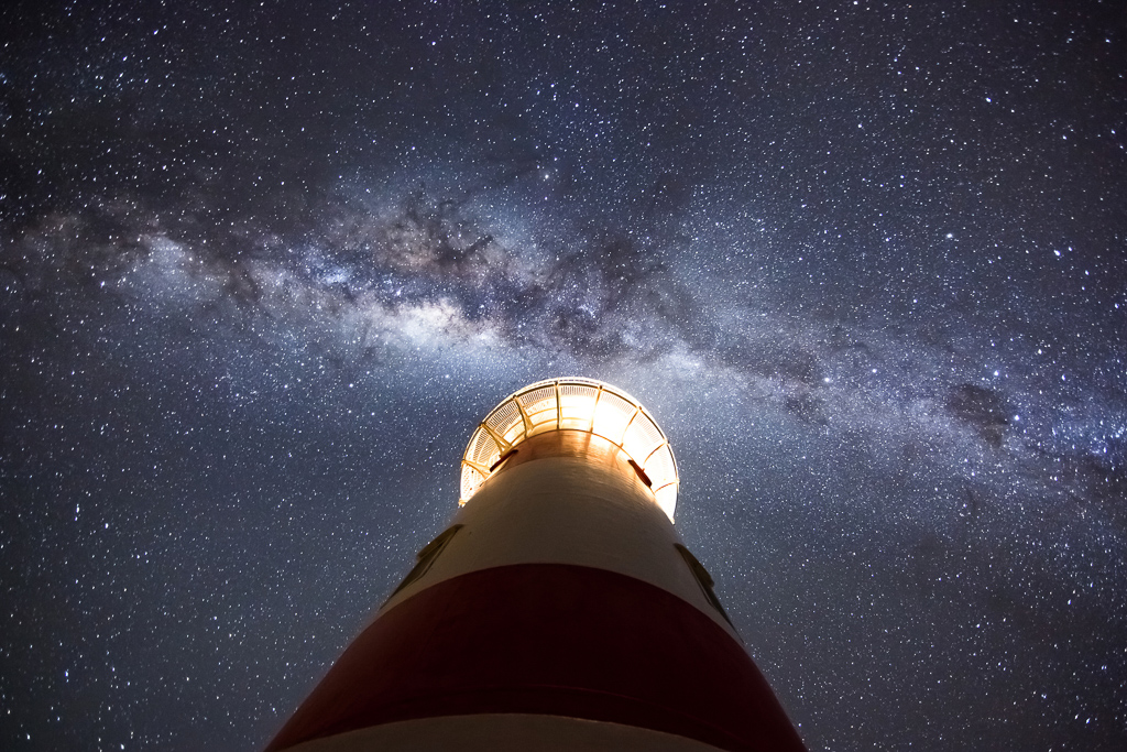 Cape Palliser Lighthouse on the North Island of New Zealand as The Milky Way hangs high overhead