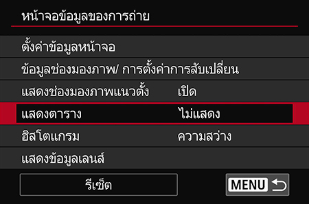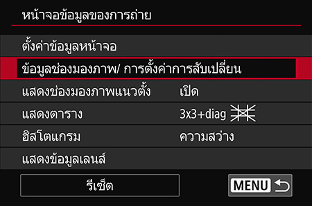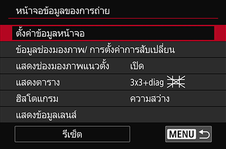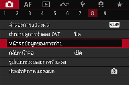ไปที่เมนูสีแดง หาและเลือกเมนู “หน้าจอข้อมูลของการถ่าย”