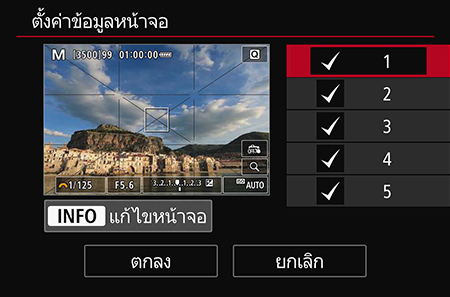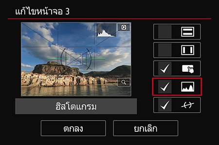 เลือกหน้าจอแสดงข้อมูลที่คุณต้องการให้แสดงฮิสโตแกรม กดปุ่ม INFO เพื่อแก้ไข