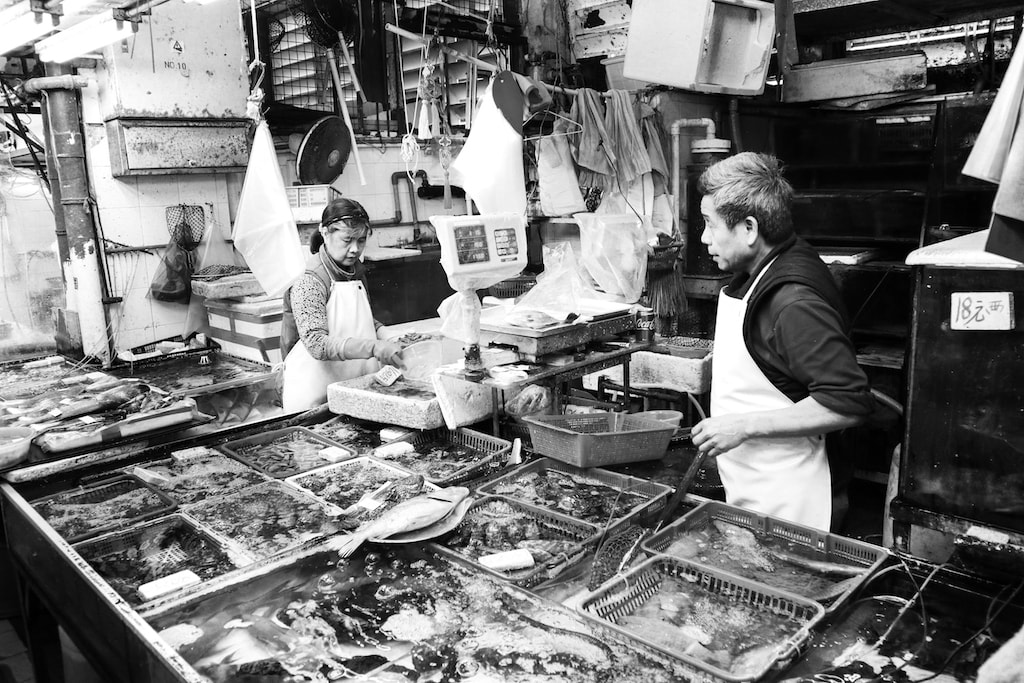 พ่อค้าแม่ค้าขายปลาสดช่วยกันทำงานเงียบๆ
