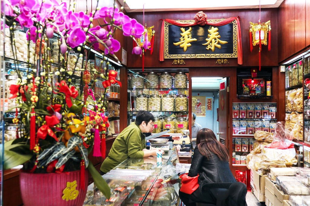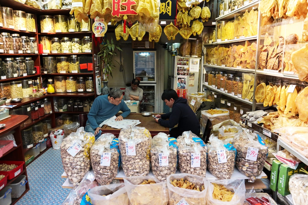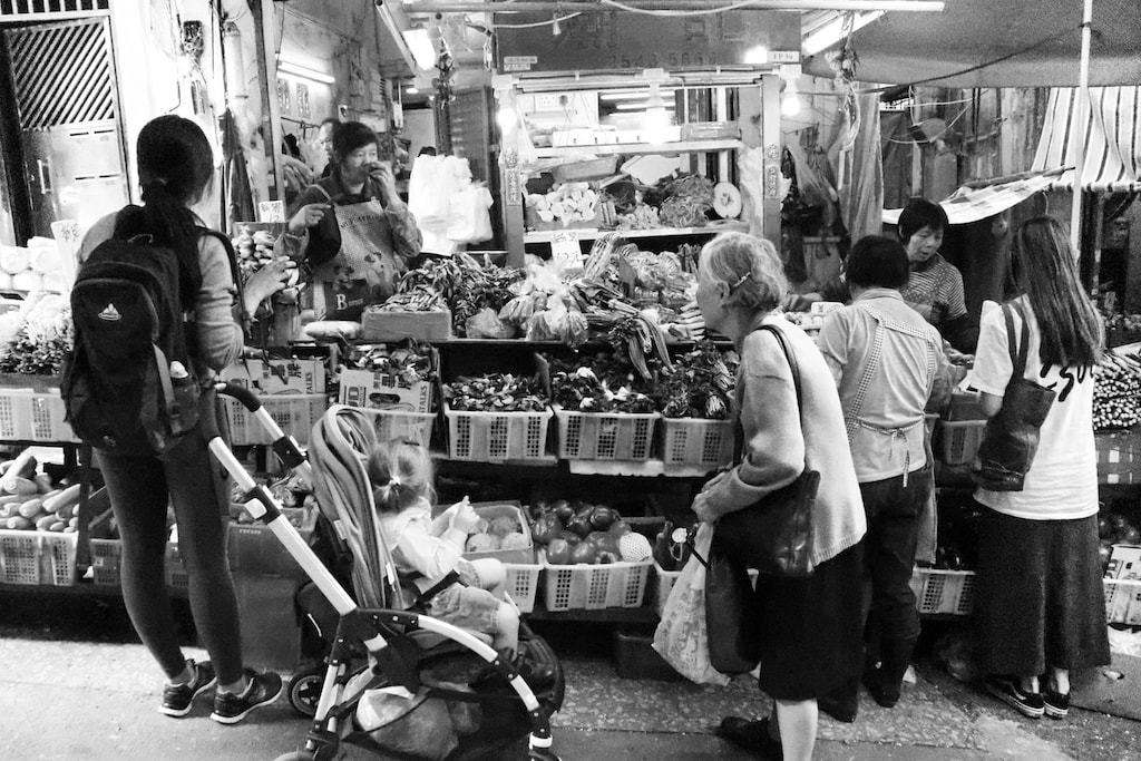 คนซื้อยืนต่อรองราคากับแม่ค้าขายผักสด ร้านค้าแบบนี้มีอยู่ทั่วฮ่องกง นับจากร้านค้าตามถนน เรื่อยไปจนถึงตลาด