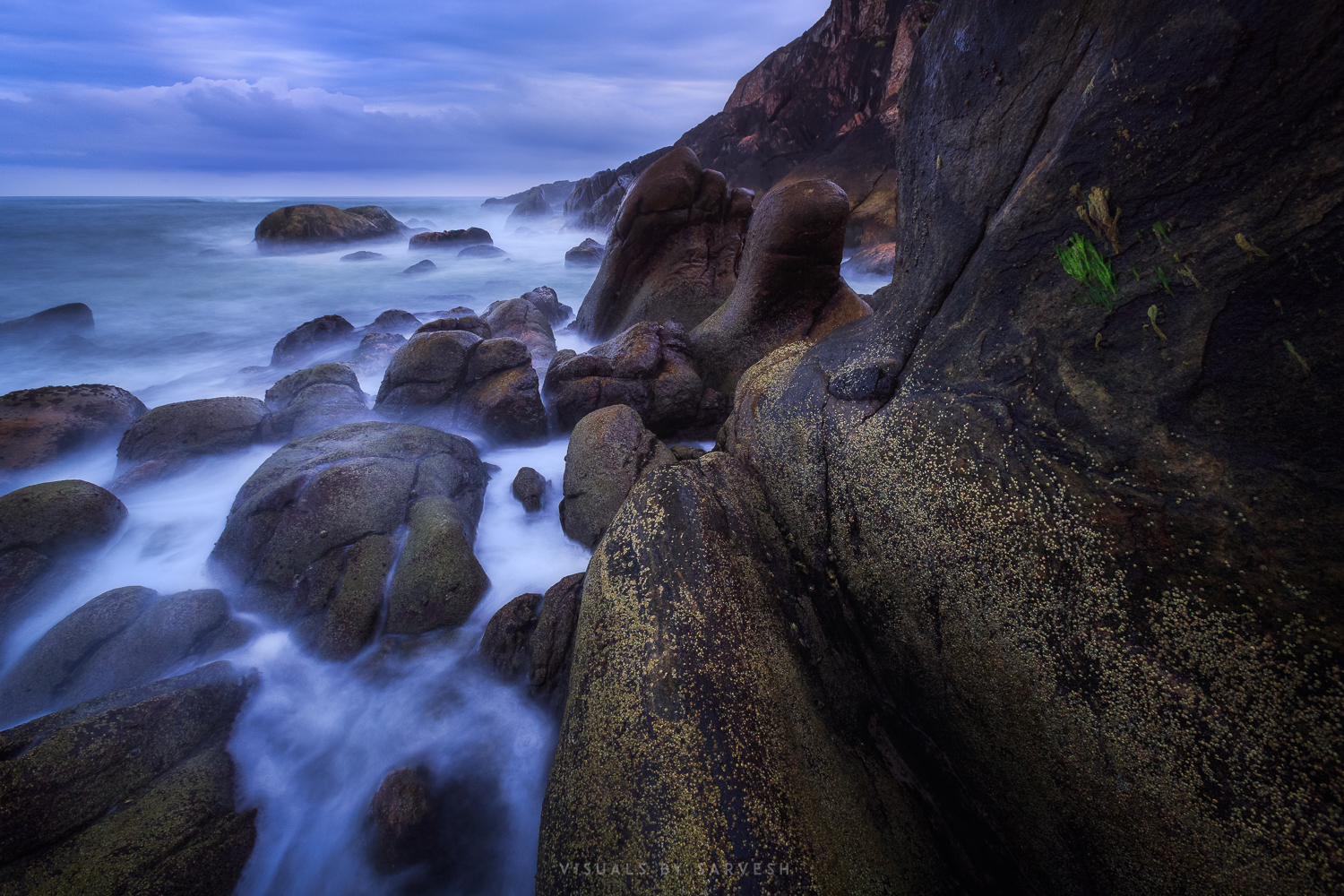 Long exposure of a blue-hour scene with passing rain clouds over the unique rock formations along the Goan coastline.