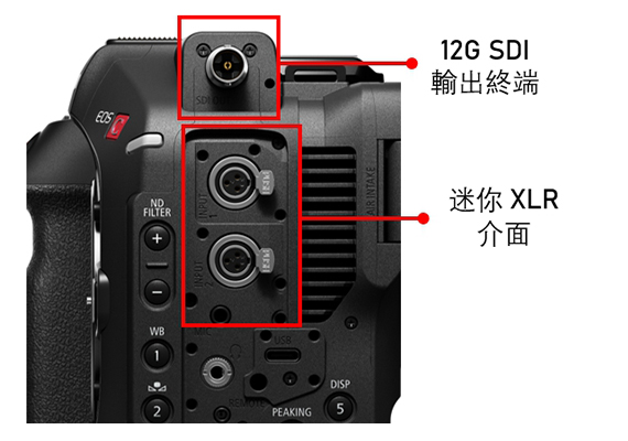EOS C80 新增了 12G-SDI 輸出終端,之前只有 EOS C500 Mark II、C400 和 EOS C300 Mark III 等更先進的機型才配備此終端。其可透過單一電纜進行 4K 50p/60p 輸出,為需要高解析度與高畫面速率工作流程的製作集提供強大的傳輸選擇。