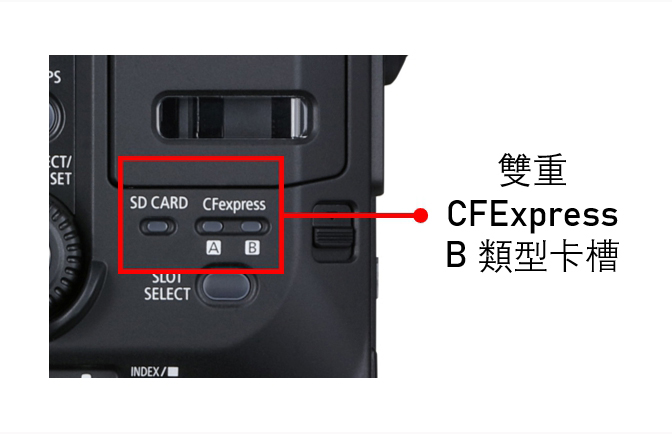 EOS C500 Mark II 的雙 CFexpress Type B 卡插槽非常適合高位元率/高比特率的錄影需求,以及同步錄影和中繼/接力錄影。