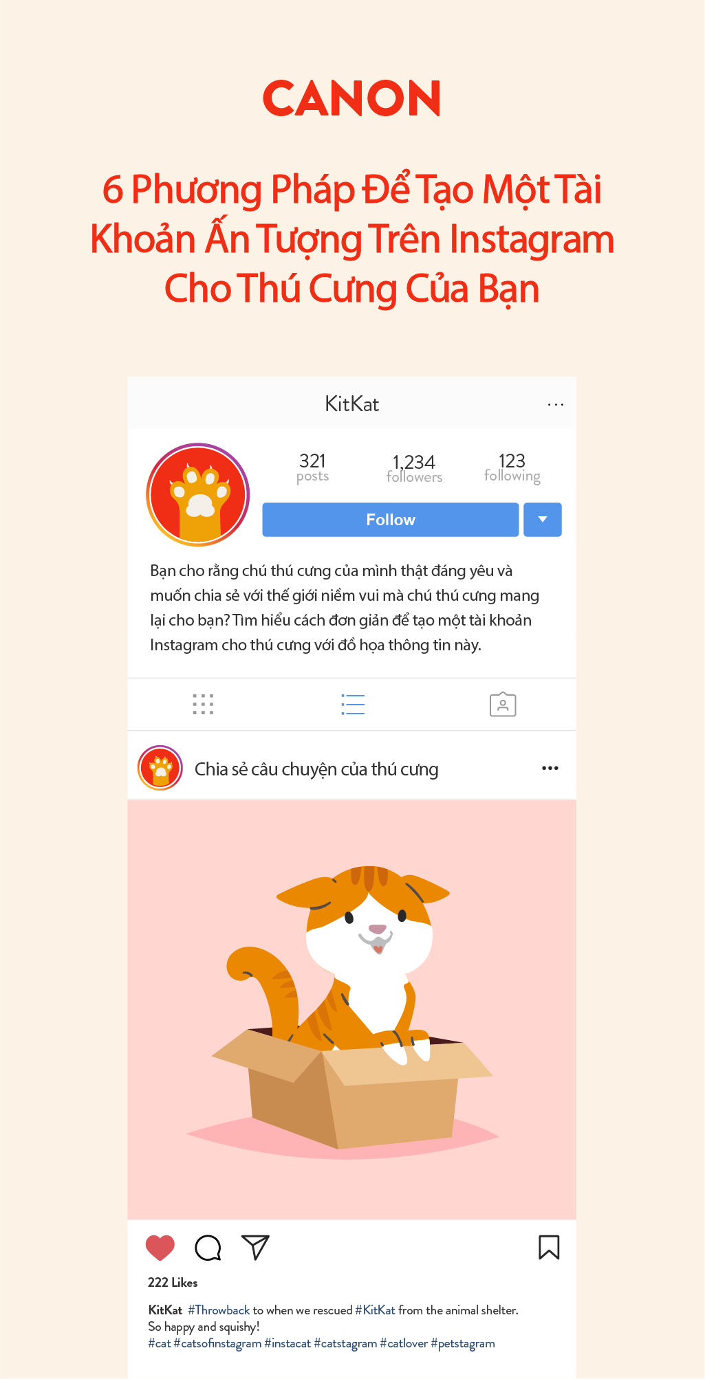 Hãy cung cấp cho những người theo dõi của bạn một chút thông tin về thú cưng để họ hiểu rõ về con vật hơn. Bạn nhận nuôi chú thú cưng như thế nào? Sau đó hãy kể cho những người theo dõi của bạn về hành trình của chú thú cưng. Nếu đó là con thú cưng rất đặc biệt, hãy chia sẻ về điều đó. Câu chuyện này sẽ hình thành tính cách và đặc điểm độc đáo cho thú cưng của bạn, tạo nên điểm khác biệt của nó so với những con vật nuôi khác trên phương tiện truyền thông xã hội. Việc chia sẻ trên Instagram chưa bao giờ dễ dàng hơn thế; Ứng dụng Kết nối Máy ảnh Canon tự động chuyển các bức ảnh về thú cưng của bạn sang một thiết bị ghép đôi thông minh theo thời gian thực.