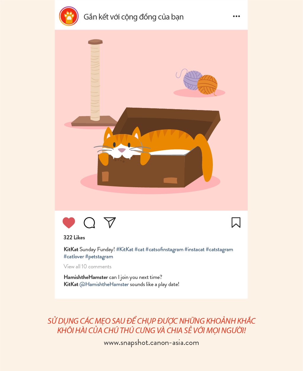 Bây giờ bạn đã tạo tài khoản Instagram cho thú cưng của mình, đã đến lúc bạn chụp những bức ảnh đáng yêu cho thú cưng rồi đó! Do mọi người thường muốn xem những hình ảnh rõ nét và đẹp đẽ trên Instagram, nên bạn hãy đảm bảo rằng những bức ảnh về thú cưng của bạn rõ nét, độc đáo và có tính thẩm mỹ cao. Hãy sử dụng ánh sáng tự nhiên bất cứ khi nào có thể và khẩu độ rộng để tạo ra những bức ảnh có độ sâu trường ảnh thấp hoặc hậu cảnh mờ nhòe. Với cảm biến 24,1-megapixel APS-C CMOS và bộ xử lý hình ảnh DIGIC 8 mới được tích hợp, máy ảnh EOS M50 cho phép bạn chụp được những bức ảnh với chi tiết chất lượng và màu sắc ưu việt. Do vậy, hãy lên kế hoạch kỹ càng cho các bức ảnh để thỏa mãn những người theo dõi bằng hình ảnh về chú thú cưng đáng yêu của mình!