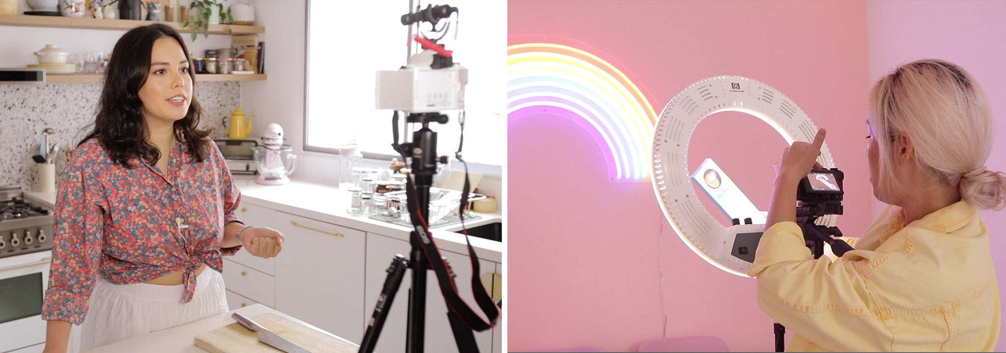 Cinddie sử dụng PowerShot G7X Mark III, còn Sarah sử dụng EOS M50 MII. Đối với cả hai người, lấy nét tự động đáng tin cậy có nghĩa là bạn có thể tự vận hành thiết bị. Ngoài một máy ảnh tốt với khả năng tái tạo màu chính xác (giúp giảm thời gian cần thiết cho quá trình xử lý hậu kỳ), ánh sáng và âm thanh tốt cũng giúp video của bạn khác biệt với những video khác. Đối với các vlogger làm đẹp như Cinddie, đèn vòng là dụng cụ quan trọng vì nó giúp chiếu sáng khi cô hướng dẫn trang điểm, giúp người xem dễ dàng nhìn thấy kết quả.