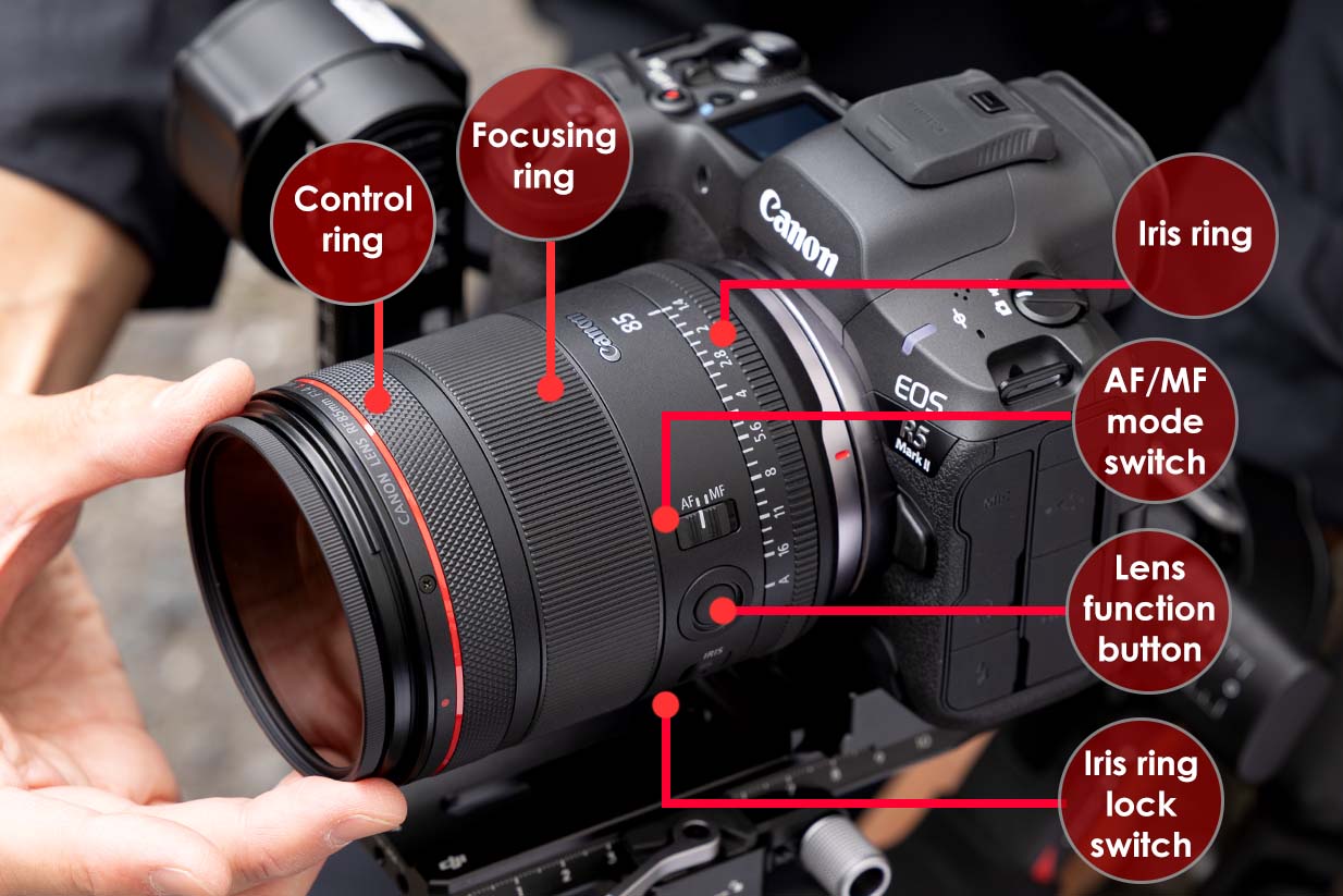 Mặc dù là ống kính chụp ảnh tĩnh rất có khả năng, nhưng thiết kế thân thiện với các nhà làm phim của ống kính RF85mm f/1.4L VCM chính là điểm khác biệt của nó so với các ống kính 85mm hiện hữu của Canon. Trung tâm của nó là vòng iris, cho phép điều chỉnh khẩu độ mượt mà và không ồn trong quá trình quay video. Khi ống kính được gắn trên EOS R1, EOS R5 Mark II, hoặc EOS R50 V*, bạn cũng có thể sử dụng vòng iris để điều khiển khẩu độ trong khi chụp ảnh tĩnh.