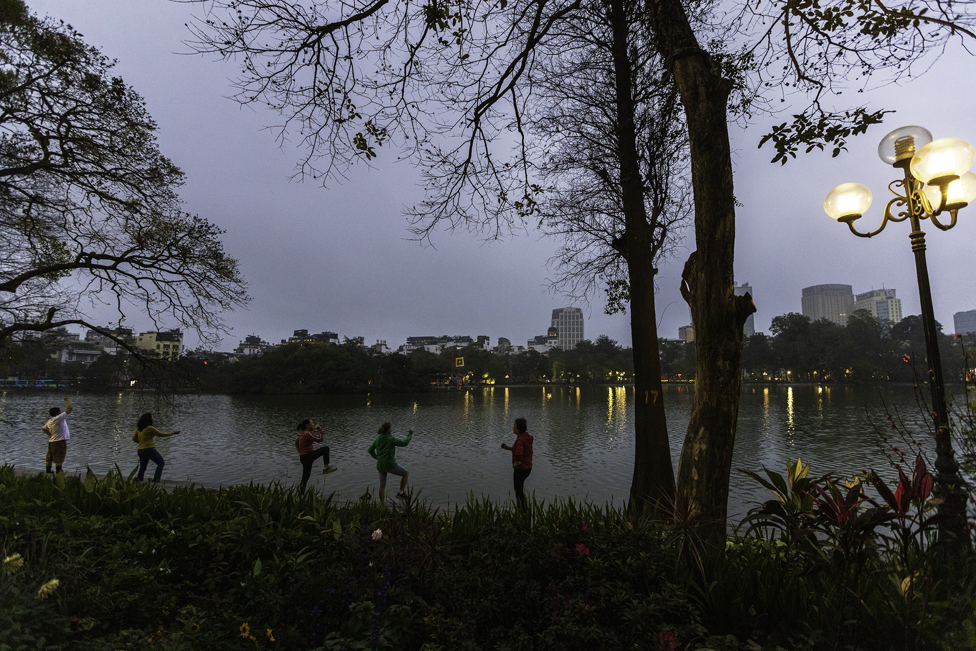 By the lake,a group of people are doing their morning exercises.Their movements are either coordinated or spontaneous, as if greeting the first breath of dawn with their bodies.Each silhouette reflects a quiet perseverance of daily life.Whether stretching kicking.or simply waving their arms, they infuse the morning with a vibrant energy.ln this scene,Hanoi's morning slowly unfolds.